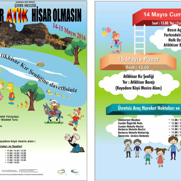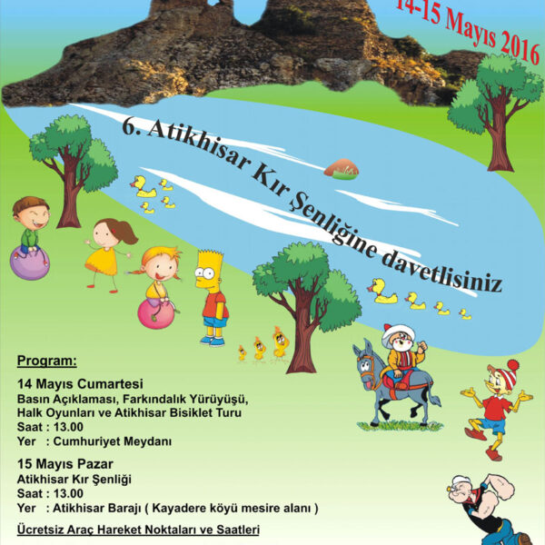 6.Atıkhisar Kır Şenliği hakkında bilgiler veren Atikhisar Kır Şenliği kolaylaştırıcısı Aksel Atay; “Çanakkale’mizin yegane içme suyu kaynağı olan Atikhisar Baraj havzasına yönelik tehditlerin tespit edilip ortadan kaldırılması ve kalıcı biçimde koruma altına alınması noktasında farkındalık yaratma hedefindeyiz. Bu amaçla geleneksel hale gelmiş olan ve bu yıl 14- 15- Mayıs 2016 tarihlerinde 6.’sı düzenlenecek Atikhisar Kır Şenliklerine tüm halkımızı bekliyoruz. 14 Mayıs cumartesi günü Cumhuriyet Meydanında saat:13.00’da yapılacak basın açıklaması sonrasında Cumhuriyet meydanından başlayıp İnönü Caddesi, çarşı içi, sahil, iskele meydanı, Prof. Dr. Türkan Saylan Sosyal tesislerine kadar devam edecek farkındalık yürüyüşümüz halk oyunları ve çocuk gösterileri eşliğinde gerçekleşecektir. Basın açıklaması sonrasında bisiklet gruplarının katılımıyla başlayacak olan Atikhisar Bisiklet Turu, kortej yürüyüşü ile birlikte devam edip sonrasında İnönü Caddesi, Dabakoğlu tesisleri, Troya caddesi ve 116 jandarma güzergahını izleyip Atikhisar Barajında tamamlanacaktır. 15 Mayıs Pazar günü ise kentimizin birçok noktasından hareket edecek servis araçları ile misafirlerimiz şenliğin yapılacağı Atikhisar Barajına ulaştırılacaklardır. Saat:13.00’da başlayacak şenliğimizde “Atikhisar “Atık”hisar Olmasın” konulu resim ve şiir yarışmasında dereceye giren öğrencilerimize ödülleri takdim edilecek. Şenlikte çeşitli konserler, eğlenceli oyun ve yarışmalar, halk oyunları gösterileri gerçekleştirilecektir” dedi.